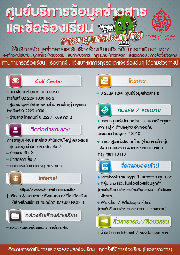 ไม่มีหมวดหมู่ที่อยู่ : 184 ถนนพระรามที่ 4 แขวงคลองเตย เขตคลองเตย กรุงเทพมหานคร 10110 ติดต่อประชาสัมพันธ์ การยาสูบแห่งประเทศไทย Call center โทร. 0-2229-1000