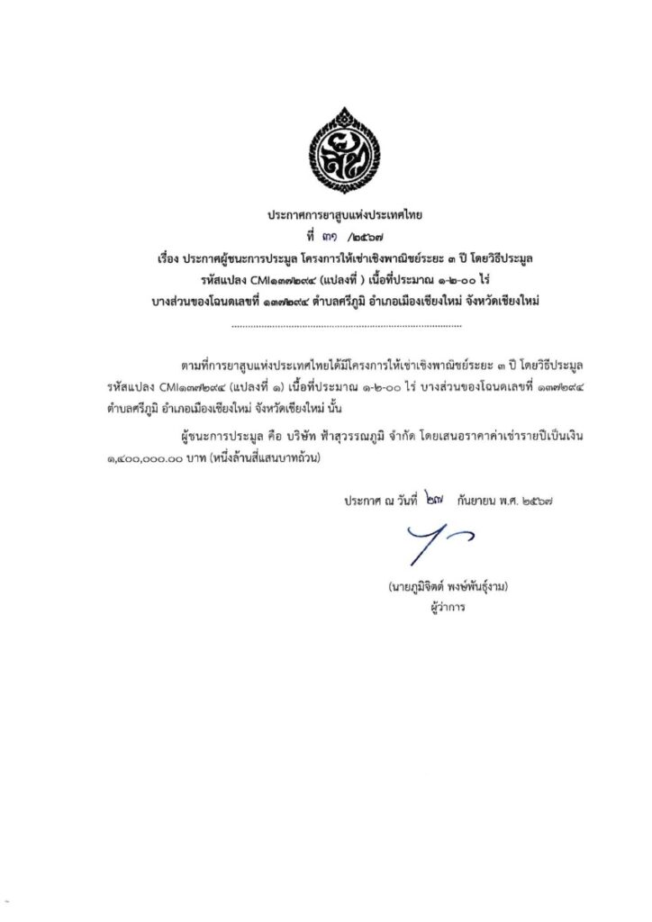ประกาศการยาสูบแห่งประเทศไทยที่ 31/2567 เรื่อง ประกาศผู้ชนะการประมูล โครงการให้เช่าเชิงพาณิชย์ระยะ 3 ปี โดยวิธีประมูล รหัสแปลง CMl137294 (แปลงที่ 1)