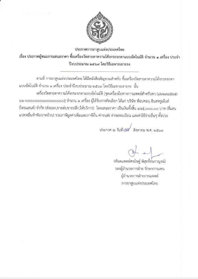 ประกาศการยาสูบแห่งประเทศไทย เรื่อง ประกาศผู้ชนะการเสนอราคา ซื้อเครื่องวัดสายตาความโค้งแบบอัตโนมัติ จำนวน 1 เครื่อง ประจำปีงบประมาณ 2569