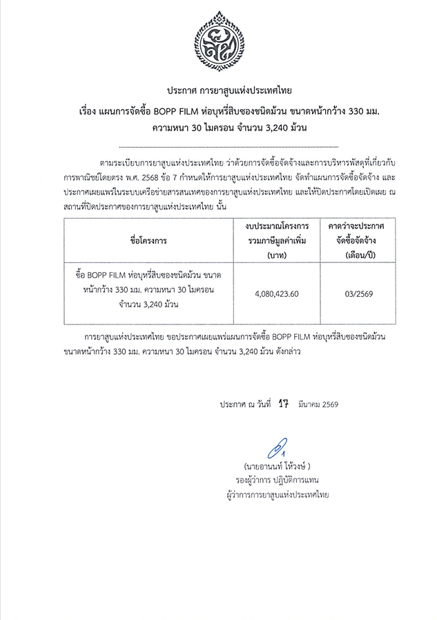 จัดซื้อ BOPP FILM ห่อบุหรี่สิบซองชนิดม้วน ขนาดหน้ากว้าง 330 มม. ความหนา 30 ไมครอน จำนวน 3,240 ม้วน