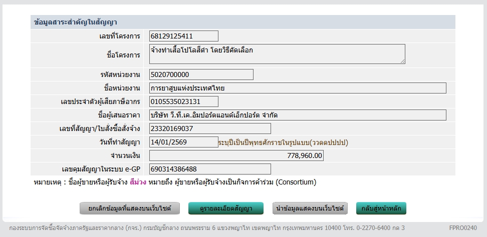 สาระสำคัญสัญญา จ้างทำเสื้อโปโลสีดำ โดยวิธีคัดเลือก (เลขที่โครงการ : 68129125411)